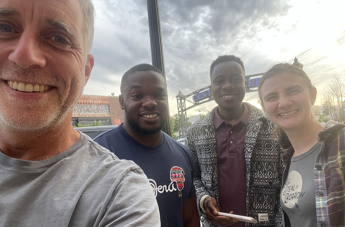 Our first lab event with Caleb — pizza on Center Street! I think Caleb was ok with the pizza but a bit sketched out by the idea of a hamburger. L to R, Carl, Chinedum, Caleb, Julia.